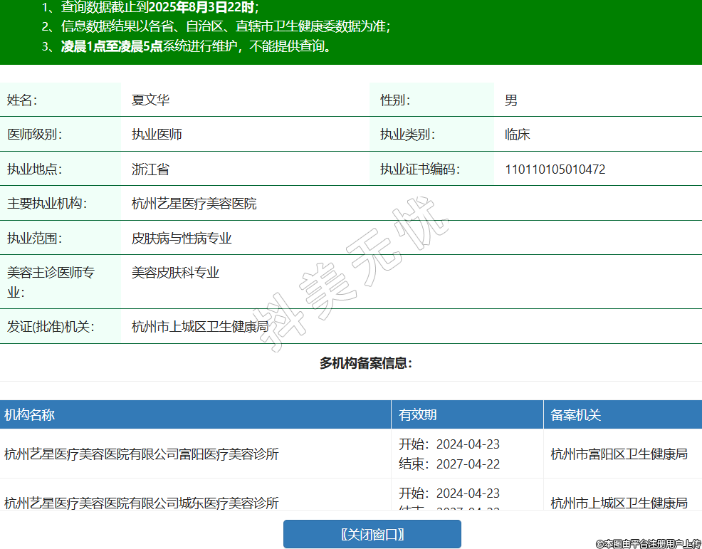 姓名:夏文華性別:男醫(yī)師級(jí)別:執(zhí)業(yè)醫(yī)師執(zhí)業(yè)類(lèi)別:臨床執(zhí)業(yè)地點(diǎn):浙江省執(zhí)業(yè)證書(shū)編碼:110110105010472主要執(zhí)業(yè)機(jī)構(gòu):杭州藝星醫(yī)療美容醫(yī)院執(zhí)業(yè)范圍:皮膚病與性病專業(yè)美容主診醫(yī)師專業(yè):美容皮膚科專業(yè)發(fā)證(批準(zhǔn))機(jī)關(guān):杭州市上城區(qū)衛(wèi)生健康局多機(jī)構(gòu)備案信息:機(jī)構(gòu)名稱 有效期 備案機(jī)關(guān) 杭州藝星醫(yī)療美容醫(yī)院有限公司富陽(yáng)醫(yī)療美容診所 開(kāi)始:2024-04-23結(jié)束:2027-04-22杭州市富陽(yáng)區(qū)衛(wèi)生健康局 杭州藝星醫(yī)療美容醫(yī)院有限公司城東醫(yī)療美容診所 開(kāi)始:2024-04-23結(jié)束:2027-04-22杭州市上城區(qū)衛(wèi)生健康局 杭州藝星醫(yī)療美容醫(yī)院有限公司城西醫(yī)療美容門(mén)診部 開(kāi)始:2024-04-23結(jié)束:2027-04-22杭州市西湖區(qū)衛(wèi)生健康局 杭州藝星醫(yī)療美容醫(yī)院有限公司余杭醫(yī)療美容診所 開(kāi)始:2025-01-08結(jié)束:2028-01-07杭州市余杭區(qū)衛(wèi)生健康局 -