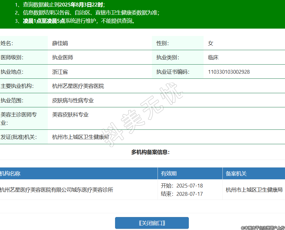 姓名:薛佳娟性別:女醫(yī)師級別:執(zhí)業(yè)醫(yī)師執(zhí)業(yè)類別:臨床執(zhí)業(yè)地點:浙江省執(zhí)業(yè)證書編碼:110330103002928主要執(zhí)業(yè)機構(gòu):杭州藝星醫(yī)療美容醫(yī)院執(zhí)業(yè)范圍:皮膚病與性病專業(yè)美容主診醫(yī)師專業(yè):美容皮膚科專業(yè)發(fā)證(批準)機關:杭州市上城區(qū)衛(wèi)生健康局多機構(gòu)備案信息:機構(gòu)名稱 有效期 備案機關 杭州藝星醫(yī)療美容醫(yī)院有限公司城東醫(yī)療美容診所 開始:2025-07-18結(jié)束:2028-07-17杭州市上城區(qū)衛(wèi)生健康局 -