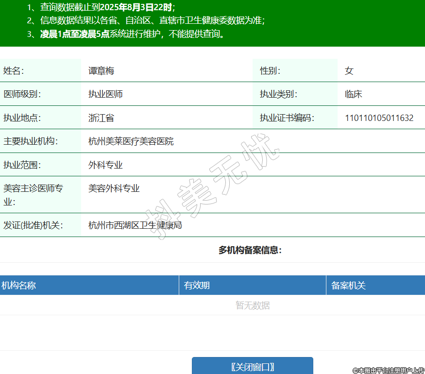 姓名:譚章梅性別:女醫(yī)師級(jí)別:執(zhí)業(yè)醫(yī)師執(zhí)業(yè)類別:臨床執(zhí)業(yè)地點(diǎn):浙江省執(zhí)業(yè)證書編碼:110110105011632主要執(zhí)業(yè)機(jī)構(gòu):杭州美萊醫(yī)療美容醫(yī)院執(zhí)業(yè)范圍:外科專業(yè)美容主診醫(yī)師專業(yè):美容外科專業(yè)發(fā)證(批準(zhǔn))機(jī)關(guān):杭州市西湖區(qū)衛(wèi)生健康局 -
