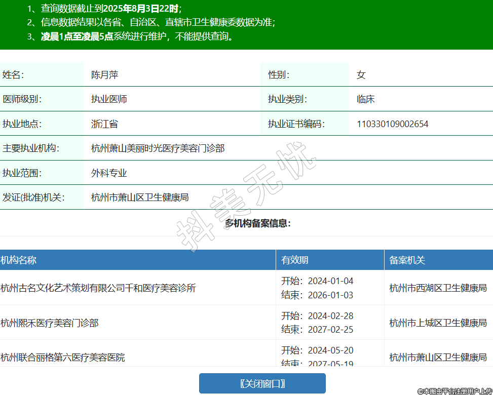 姓名:陳月萍性別:女醫(yī)師級(jí)別:執(zhí)業(yè)醫(yī)師執(zhí)業(yè)類(lèi)別:臨床執(zhí)業(yè)地點(diǎn):浙江省執(zhí)業(yè)證書(shū)編碼:110330109002654主要執(zhí)業(yè)機(jī)構(gòu):杭州蕭山美麗時(shí)光醫(yī)療美容門(mén)診部執(zhí)業(yè)范圍:外科專(zhuān)業(yè)發(fā)證(批準(zhǔn))機(jī)關(guān):杭州市蕭山區(qū)衛(wèi)生健康局多機(jī)構(gòu)備案信息:機(jī)構(gòu)名稱(chēng) 有效期 備案機(jī)關(guān) 杭州古名文化藝術(shù)策劃有限公司千和醫(yī)療美容診所 開(kāi)始:2024-01-04結(jié)束:2026-01-03杭州市西湖區(qū)衛(wèi)生健康局 杭州熙禾醫(yī)療美容門(mén)診部 開(kāi)始:2024-02-28結(jié)束:2027-02-25杭州市上城區(qū)衛(wèi)生健康局 杭州聯(lián)合麗格第六醫(yī)療美容醫(yī)院 開(kāi)始:2024-05-20結(jié)束:2027-05-19杭州市蕭山區(qū)衛(wèi)生健康局 杭州仁術(shù)醫(yī)療管理有限公司臨平秀浦街醫(yī)療美容診所 開(kāi)始:2024-09-03結(jié)束:2027-09-01杭州市臨平區(qū)衛(wèi)生健康局 杭州潔銘威塑醫(yī)療美容醫(yī)院 開(kāi)始:2025-01-10結(jié)束:2026-01-09杭州市拱墅區(qū)衛(wèi)生健康局 寧波鄞州亮騰醫(yī)療美容診所 開(kāi)始:2025-03-18結(jié)束:2026-03-13寧波市鄞州區(qū)衛(wèi)生健康局 杭州熙柚醫(yī)療美容門(mén)診部 開(kāi)始:2025-06-04結(jié)束:2028-06-03杭州市上城區(qū)衛(wèi)生健康局 金華金東本真醫(yī)療美容門(mén)診部 開(kāi)始:2025-07-08結(jié)束:2027-07-07金華市金東區(qū)衛(wèi)生健康局 -