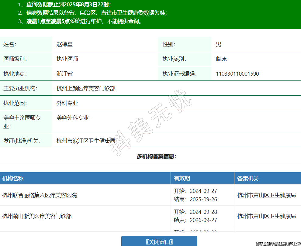 姓名:趙德星性別:男醫(yī)師級(jí)別:執(zhí)業(yè)醫(yī)師執(zhí)業(yè)類別:臨床執(zhí)業(yè)地點(diǎn):浙江省執(zhí)業(yè)證書(shū)編碼:110330110001590主要執(zhí)業(yè)機(jī)構(gòu):杭州上顏醫(yī)療美容門診部執(zhí)業(yè)范圍:外科專業(yè)美容主診醫(yī)師專業(yè):美容外科專業(yè)發(fā)證(批準(zhǔn))機(jī)關(guān):杭州市濱江區(qū)衛(wèi)生健康局多機(jī)構(gòu)備案信息:機(jī)構(gòu)名稱 有效期 備案機(jī)關(guān) 杭州聯(lián)合麗格第六醫(yī)療美容醫(yī)院 開(kāi)始:2024-09-27結(jié)束:2025-09-26杭州市蕭山區(qū)衛(wèi)生健康局 杭州蕭山浙美醫(yī)療美容門診部 開(kāi)始:2024-09-28結(jié)束:2026-09-27杭州市蕭山區(qū)衛(wèi)生健康局 杭州禧顏鳳起綜合門診部 開(kāi)始:2024-09-29結(jié)束:2026-09-28杭州市拱墅區(qū)衛(wèi)生健康局 杭州立柏恩醫(yī)療美容有限公司蕭山利一路醫(yī)療美容診所 開(kāi)始:2024-09-30結(jié)束:2025-09-29杭州市蕭山區(qū)衛(wèi)生健康局 杭州妍尚醫(yī)療美容門診部 開(kāi)始:2024-10-08結(jié)束:2026-10-09杭州市上城區(qū)衛(wèi)生健康局 杭州氧葉星璨醫(yī)療美容門診部 開(kāi)始:2024-10-15結(jié)束:2026-10-14杭州市拱墅區(qū)衛(wèi)生健康局 杭州蕭山童顏醫(yī)療美容門診部 開(kāi)始:2024-11-03結(jié)束:2026-11-03杭州市蕭山區(qū)衛(wèi)生健康局 杭州仁術(shù)醫(yī)療管理有限公司臨平秀浦街醫(yī)療美容診所 開(kāi)始:2024-12-05結(jié)束:2026-12-04杭州市臨平區(qū)衛(wèi)生健康局 杭州熙禾醫(yī)療美容門診部 開(kāi)始:2024-12-12結(jié)束:2026-12-11杭州市上城區(qū)衛(wèi)生健康局 杭州蕭山新美薈醫(yī)療美容門診部 開(kāi)始:2024-12-30結(jié)束:2026-12-29杭州市蕭山區(qū)衛(wèi)生健康局 杭州虎山林畔醫(yī)療美容門診部 開(kāi)始:2024-12-31結(jié)束:2026-12-30杭州市拱墅區(qū)衛(wèi)生健康局 杭州潔銘威塑醫(yī)療美容醫(yī)院 開(kāi)始:2025-01-24結(jié)束:2026-01-23杭州市拱墅區(qū)衛(wèi)生健康局 平陽(yáng)金蔻醫(yī)療美容診所 開(kāi)始:2025-03-03結(jié)束:2027-03-02平陽(yáng)縣衛(wèi)生健康局 杭州蕭山貝吉雅醫(yī)療美容門診部 開(kāi)始:2025-03-30結(jié)束:2026-03-29杭州市蕭山區(qū)衛(wèi)生健康局 杭州蕭山滬顏醫(yī)療美容門診部 開(kāi)始:2025-04-13結(jié)束:2026-04-12杭州市蕭山區(qū)衛(wèi)生健康局 杭州喜樂(lè)醫(yī)療美容診所 開(kāi)始:2025-04-16結(jié)束:2027-04-15杭州市西湖區(qū)衛(wèi)生健康局 杭州美姿醫(yī)療美容門診部 開(kāi)始:2025-05-07結(jié)束:2027-05-06杭州市上城區(qū)衛(wèi)生健康局 杭州舒睿萊醫(yī)療美容診所 開(kāi)始:2025-06-18結(jié)束:2028-06-17杭州市濱江區(qū)衛(wèi)生健康局 杭州熙柚醫(yī)療美容門診部 開(kāi)始:2025-07-15結(jié)束:2028-07-14杭州市上城區(qū)衛(wèi)生健康局 -
