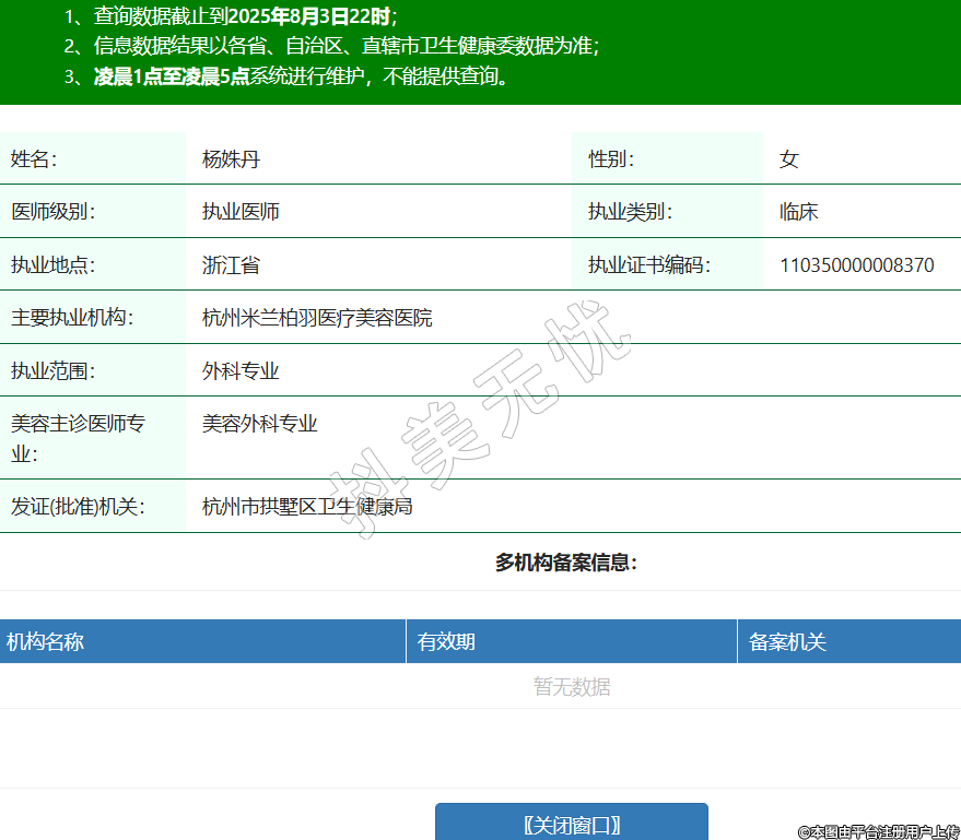 姓名:楊姝丹性別:女醫(yī)師級別:執(zhí)業(yè)醫(yī)師執(zhí)業(yè)類別:臨床執(zhí)業(yè)地點:浙江省執(zhí)業(yè)證書編碼:110350000008370主要執(zhí)業(yè)機構:杭州米蘭柏羽醫(yī)療美容醫(yī)院執(zhí)業(yè)范圍:外科專業(yè)美容主診醫(yī)師專業(yè):美容外科專業(yè)發(fā)證(批準)機關:杭州市拱墅區(qū)衛(wèi)生健康局 -