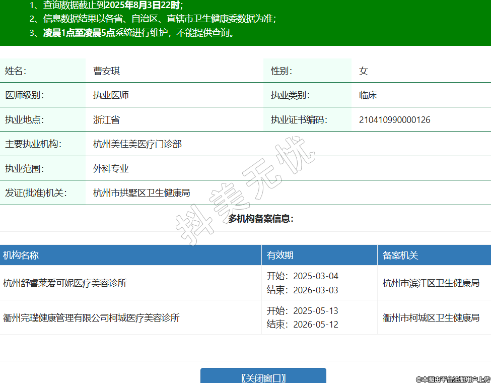 姓名:曹安琪性別:女醫(yī)師級別:執(zhí)業(yè)醫(yī)師執(zhí)業(yè)類別:臨床執(zhí)業(yè)地點:浙江省執(zhí)業(yè)證書編碼:210410990000126主要執(zhí)業(yè)機構(gòu):杭州美佳美醫(yī)療門診部執(zhí)業(yè)范圍:外科專業(yè)發(fā)證(批準(zhǔn))機關(guān):杭州市拱墅區(qū)衛(wèi)生健康局多機構(gòu)備案信息:機構(gòu)名稱 有效期 備案機關(guān) 杭州舒睿萊愛可妮醫(yī)療美容診所 開始:2025-03-04結(jié)束:2026-03-03杭州市濱江區(qū)衛(wèi)生健康局 衢州完璞健康管理有限公司柯城醫(yī)療美容診所 開始:2025-05-13結(jié)束:2026-05-12衢州市柯城區(qū)衛(wèi)生健康局 -