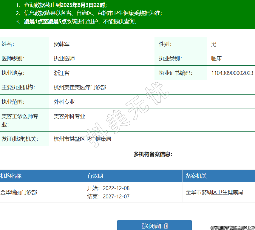 姓名:賀韓軍性別:男醫(yī)師級別:執(zhí)業(yè)醫(yī)師執(zhí)業(yè)類別:臨床執(zhí)業(yè)地點:浙江省執(zhí)業(yè)證書編碼:110430900002023主要執(zhí)業(yè)機構:杭州美佳美醫(yī)療門診部執(zhí)業(yè)范圍:外科專業(yè)美容主診醫(yī)師專業(yè):美容外科專業(yè)發(fā)證(批準)機關:杭州市拱墅區(qū)衛(wèi)生健康局多機構備案信息:機構名稱 有效期 備案機關 金華瑞麗門診部 開始:2022-12-08結束:2027-12-07金華市婺城區(qū)衛(wèi)生健康局 -