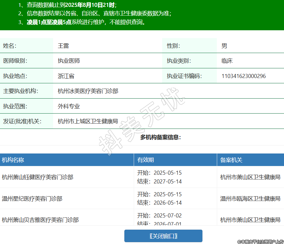 姓名:王雷性別:男醫(yī)師級別:執(zhí)業(yè)醫(yī)師執(zhí)業(yè)類別:臨床執(zhí)業(yè)地點(diǎn):浙江省執(zhí)業(yè)證書編碼:110341623000296主要執(zhí)業(yè)機(jī)構(gòu):杭州冰美醫(yī)療美容門診部執(zhí)業(yè)范圍:外科專業(yè)發(fā)證(批準(zhǔn))機(jī)關(guān):杭州市上城區(qū)衛(wèi)生健康局多機(jī)構(gòu)備案信息:機(jī)構(gòu)名稱 有效期 備案機(jī)關(guān) 杭州蕭山鈺健醫(yī)療美容門診部 開始:2025-05-15結(jié)束:2027-05-14杭州市蕭山區(qū)衛(wèi)生健康局 溫州星紀(jì)醫(yī)療美容門診部 開始:2025-05-15結(jié)束:2026-05-14溫州市甌海區(qū)衛(wèi)生健康局 杭州蕭山貝吉雅醫(yī)療美容門診部 開始:2025-07-02結(jié)束:2026-07-01杭州市蕭山區(qū)衛(wèi)生健康局 -