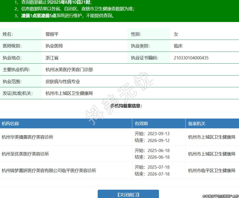 姓名:曾麗平性別:女醫(yī)師級別:執(zhí)業(yè)醫(yī)師執(zhí)業(yè)類別:臨床執(zhí)業(yè)地點(diǎn):浙江省執(zhí)業(yè)證書編碼:210330104000435主要執(zhí)業(yè)機(jī)構(gòu):杭州冰美醫(yī)療美容門診部執(zhí)業(yè)范圍:皮膚病與性病專業(yè)發(fā)證(批準(zhǔn))機(jī)關(guān):杭州市上城區(qū)衛(wèi)生健康局多機(jī)構(gòu)備案信息:機(jī)構(gòu)名稱 有效期 備案機(jī)關(guān) 杭州華美禧善醫(yī)療美容診所 開始:2023-09-13結(jié)束:2026-09-12杭州市上城區(qū)衛(wèi)生健康局 杭州至優(yōu)美醫(yī)療美容診所 開始:2025-06-18結(jié)束:2026-06-18杭州市上城區(qū)衛(wèi)生健康局 杭州鑄夢嘉妍醫(yī)療美容有限公司臨平醫(yī)療美容診所 開始:2025-07-18結(jié)束:2026-07-18杭州市臨平區(qū)衛(wèi)生健康局 -