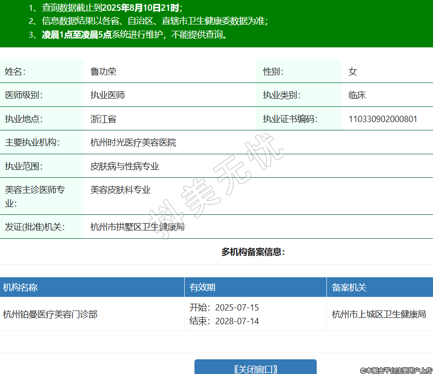 姓名:魯功榮性別:女醫(yī)師級(jí)別:執(zhí)業(yè)醫(yī)師執(zhí)業(yè)類別:臨床執(zhí)業(yè)地點(diǎn):浙江省執(zhí)業(yè)證書編碼:110330902000801主要執(zhí)業(yè)機(jī)構(gòu):杭州時(shí)光醫(yī)療美容醫(yī)院執(zhí)業(yè)范圍:皮膚病與性病專業(yè)美容主診醫(yī)師專業(yè):美容皮膚科專業(yè)發(fā)證(批準(zhǔn))機(jī)關(guān):杭州市拱墅區(qū)衛(wèi)生健康局多機(jī)構(gòu)備案信息:機(jī)構(gòu)名稱 有效期 備案機(jī)關(guān) 杭州鉑曼醫(yī)療美容門診部 開始:2025-07-15結(jié)束:2028-07-14杭州市上城區(qū)衛(wèi)生健康局 -