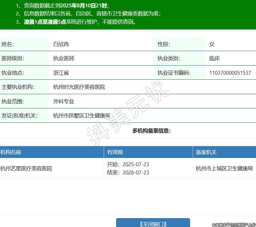 姓名:白欣冉性別:女醫(yī)師級別:執(zhí)業(yè)醫(yī)師執(zhí)業(yè)類別:臨床執(zhí)業(yè)地點:浙江省執(zhí)業(yè)證書編碼:110370000051537主要執(zhí)業(yè)機(jī)構(gòu):杭州時光醫(yī)療美容醫(yī)院執(zhí)業(yè)范圍:外科專業(yè)發(fā)證(批準(zhǔn))機(jī)關(guān):杭州市拱墅區(qū)衛(wèi)生健康局多機(jī)構(gòu)備案信息:機(jī)構(gòu)名稱 有效期 備案機(jī)關(guān) 杭州藝星醫(yī)療美容醫(yī)院 開始:2025-07-23結(jié)束:2028-07-23杭州市上城區(qū)衛(wèi)生健康局 -