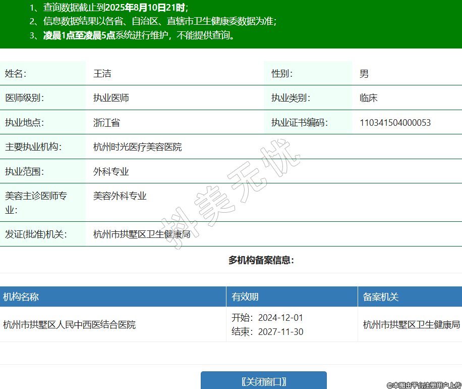 姓名:王潔性別:男醫(yī)師級別:執(zhí)業(yè)醫(yī)師執(zhí)業(yè)類別:臨床執(zhí)業(yè)地點(diǎn):浙江省執(zhí)業(yè)證書編碼:110341504000053主要執(zhí)業(yè)機(jī)構(gòu):杭州時(shí)光醫(yī)療美容醫(yī)院執(zhí)業(yè)范圍:外科專業(yè)美容主診醫(yī)師專業(yè):美容外科專業(yè)發(fā)證(批準(zhǔn))機(jī)關(guān):杭州市拱墅區(qū)衛(wèi)生健康局多機(jī)構(gòu)備案信息:機(jī)構(gòu)名稱 有效期 備案機(jī)關(guān) 杭州市拱墅區(qū)人民中西醫(yī)結(jié)合醫(yī)院 開始:2024-12-01結(jié)束:2027-11-30杭州市拱墅區(qū)衛(wèi)生健康局 -
