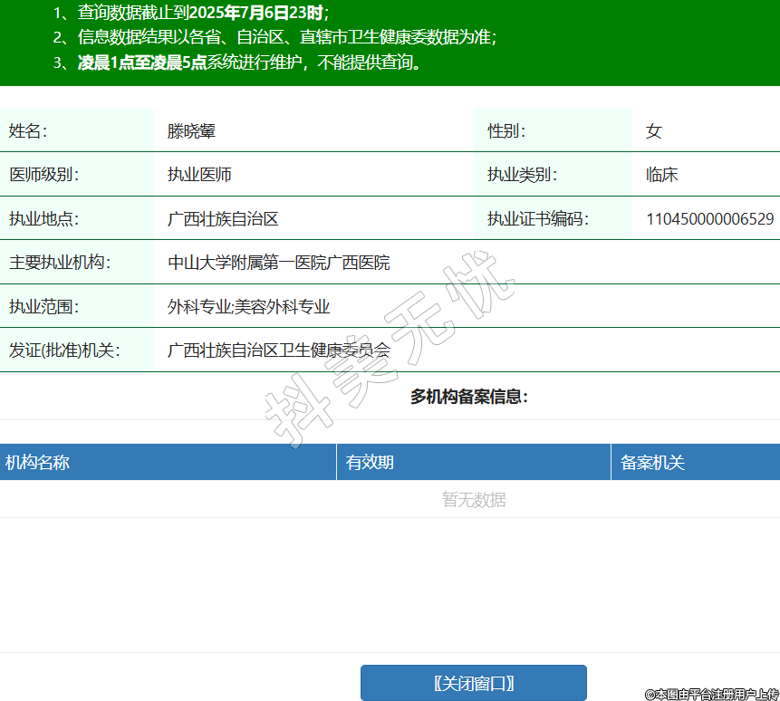 姓名:滕曉顰性別:女醫(yī)師級別:執(zhí)業(yè)醫(yī)師執(zhí)業(yè)類別:臨床執(zhí)業(yè)地點(diǎn):廣西壯族自治區(qū)執(zhí)業(yè)證書編碼:110450000006529主要執(zhí)業(yè)機(jī)構(gòu):中山大學(xué)附屬第一醫(yī)院廣西醫(yī)院執(zhí)業(yè)范圍:外科專業(yè);美容外科專業(yè)發(fā)證(批準(zhǔn))機(jī)關(guān):廣西壯族自治區(qū)衛(wèi)生健康委員會 -
