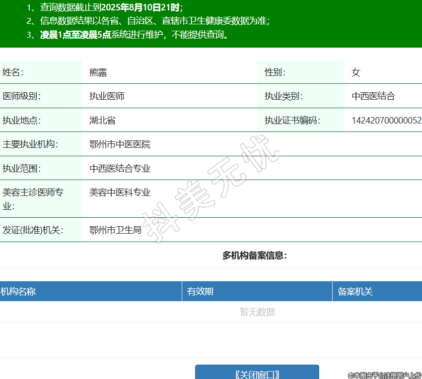 姓名:熊露性別:女醫(yī)師級別:執(zhí)業(yè)醫(yī)師執(zhí)業(yè)類別:中西醫(yī)結(jié)合執(zhí)業(yè)地點:湖北省執(zhí)業(yè)證書編碼:142420700000052主要執(zhí)業(yè)機構(gòu):鄂州市中醫(yī)醫(yī)院執(zhí)業(yè)范圍:中西醫(yī)結(jié)合專業(yè)美容主診醫(yī)師專業(yè):美容中醫(yī)科專業(yè)發(fā)證(批準)機關(guān):鄂州市衛(wèi)生局 -