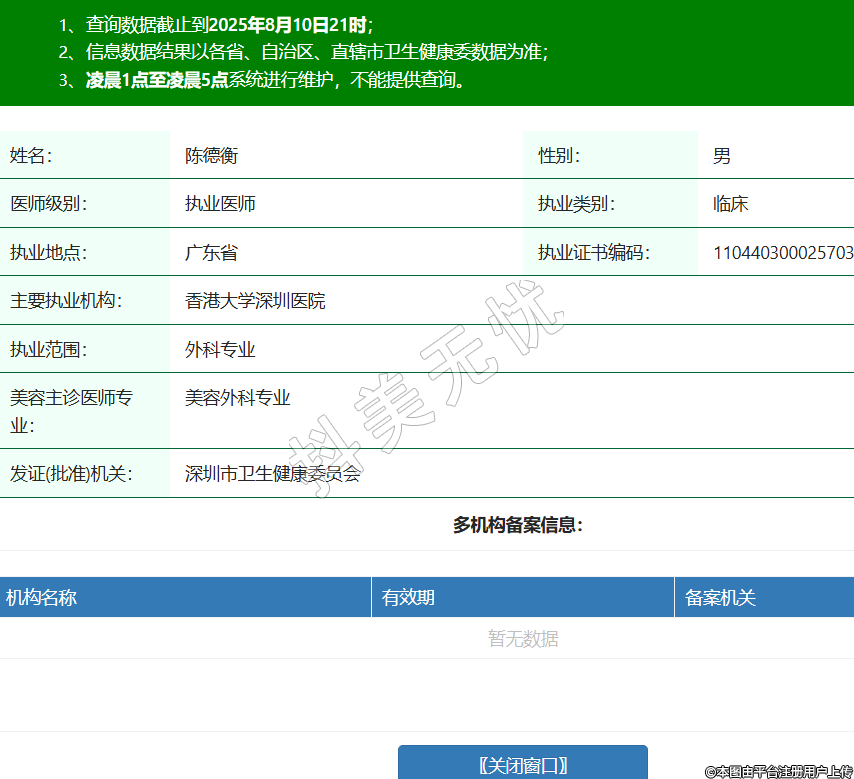 姓名:陳德衡性別:男醫(yī)師級(jí)別:執(zhí)業(yè)醫(yī)師執(zhí)業(yè)類別:臨床執(zhí)業(yè)地點(diǎn):廣東省執(zhí)業(yè)證書編碼:110440300025703主要執(zhí)業(yè)機(jī)構(gòu):香港大學(xué)深圳醫(yī)院執(zhí)業(yè)范圍:外科專業(yè)美容主診醫(yī)師專業(yè):美容外科專業(yè)發(fā)證(批準(zhǔn))機(jī)關(guān):深圳市衛(wèi)生健康委員會(huì) -