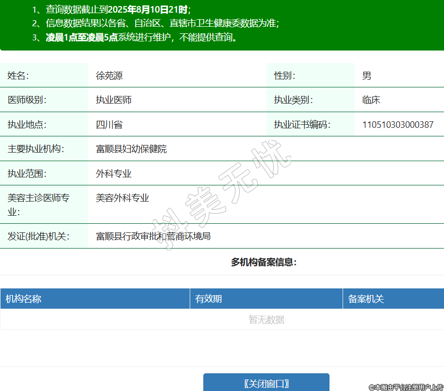姓名:徐苑源性別:男醫(yī)師級(jí)別:執(zhí)業(yè)醫(yī)師執(zhí)業(yè)類別:臨床執(zhí)業(yè)地點(diǎn):四川省執(zhí)業(yè)證書編碼:110510303000387主要執(zhí)業(yè)機(jī)構(gòu):富順縣婦幼保健院執(zhí)業(yè)范圍:外科專業(yè)美容主診醫(yī)師專業(yè):美容外科專業(yè)發(fā)證(批準(zhǔn))機(jī)關(guān):富順縣行政審批和營(yíng)商環(huán)境局 -