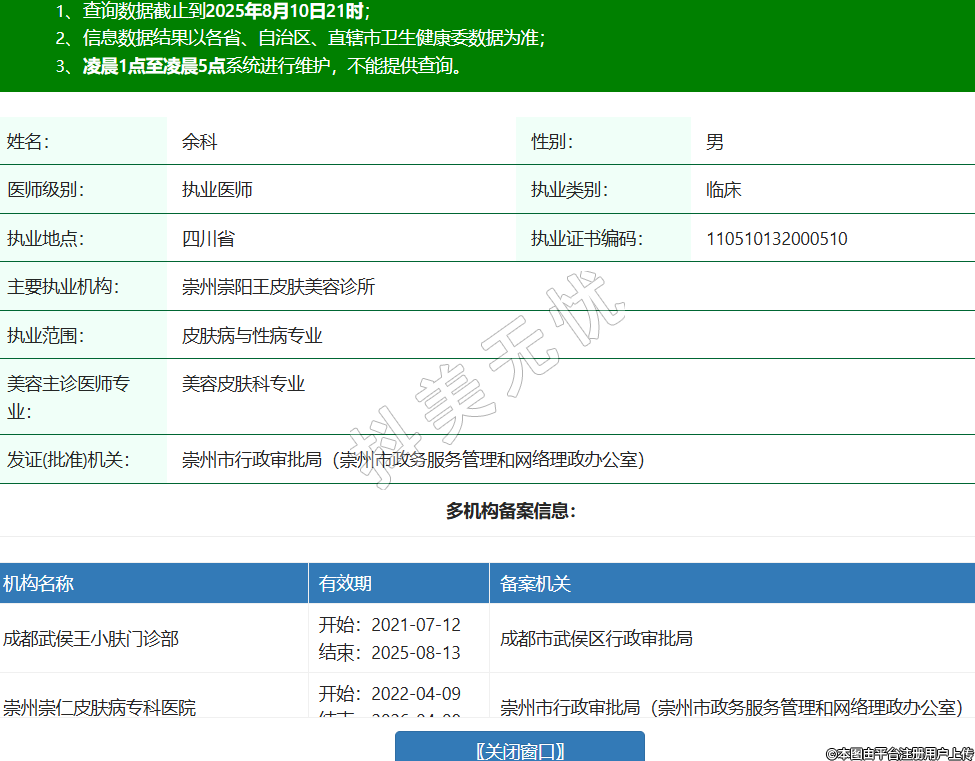 姓名:余科性別:男醫(yī)師級別:執(zhí)業(yè)醫(yī)師執(zhí)業(yè)類別:臨床執(zhí)業(yè)地點:四川省執(zhí)業(yè)證書編碼:110510132000510主要執(zhí)業(yè)機構(gòu):崇州崇陽王皮膚美容診所執(zhí)業(yè)范圍:皮膚病與性病專業(yè)美容主診醫(yī)師專業(yè):美容皮膚科專業(yè)發(fā)證(批準)機關(guān):崇州市行政審批局(崇州市政務(wù)服務(wù)管理和網(wǎng)絡(luò)理政辦公室)多機構(gòu)備案信息:機構(gòu)名稱 有效期 備案機關(guān) 成都武侯王小膚門診部 開始:2021-07-12結(jié)束:2025-08-13成都市武侯區(qū)行政審批局 崇州崇仁皮膚病??漆t(yī)院 開始:2022-04-09結(jié)束:2026-04-08崇州市行政審批局(崇州市政務(wù)服務(wù)管理和網(wǎng)絡(luò)理政辦公室) 崇州謝雪冰皮膚診所 開始:2023-10-21結(jié)束:2026-10-20崇州市行政審批局(崇州市政務(wù)服務(wù)管理和網(wǎng)絡(luò)理政辦公室) 崇州崇仁醫(yī)院 開始:2024-02-01結(jié)束:2029-01-30崇州市行政審批局(崇州市政務(wù)服務(wù)管理和網(wǎng)絡(luò)理政辦公室) 崇州崇陽漢密爾頓醫(yī)學(xué)美容門診部 開始:2025-06-10結(jié)束:2026-06-09崇州市行政審批局(崇州市政務(wù)服務(wù)管理和網(wǎng)絡(luò)理政辦公室) -