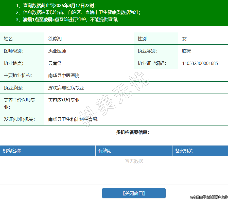 姓名:徐德湘性別:女醫(yī)師級(jí)別:執(zhí)業(yè)醫(yī)師執(zhí)業(yè)類別:臨床執(zhí)業(yè)地點(diǎn):云南省執(zhí)業(yè)證書編碼:110532300001685主要執(zhí)業(yè)機(jī)構(gòu):南華縣中醫(yī)醫(yī)院執(zhí)業(yè)范圍:皮膚病與性病專業(yè)美容主診醫(yī)師專業(yè):美容皮膚科專業(yè)發(fā)證(批準(zhǔn))機(jī)關(guān):南華縣衛(wèi)生和計(jì)劃生育局 -
