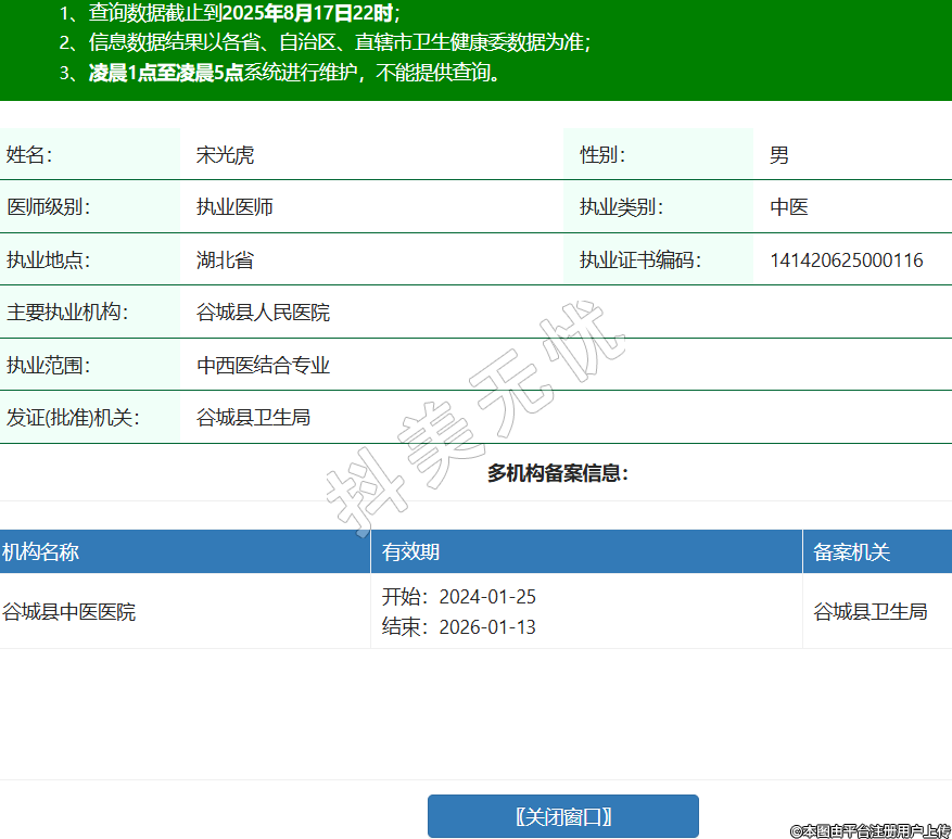 姓名:宋光虎性別:男醫(yī)師級別:執(zhí)業(yè)醫(yī)師執(zhí)業(yè)類別:中醫(yī)執(zhí)業(yè)地點:湖北省執(zhí)業(yè)證書編碼:141420625000116主要執(zhí)業(yè)機構(gòu):谷城縣人民醫(yī)院執(zhí)業(yè)范圍:中西醫(yī)結(jié)合專業(yè)發(fā)證(批準(zhǔn))機關(guān):谷城縣衛(wèi)生局多機構(gòu)備案信息:機構(gòu)名稱 有效期 備案機關(guān) 谷城縣中醫(yī)醫(yī)院 開始:2024-01-25結(jié)束:2026-01-13谷城縣衛(wèi)生局 -