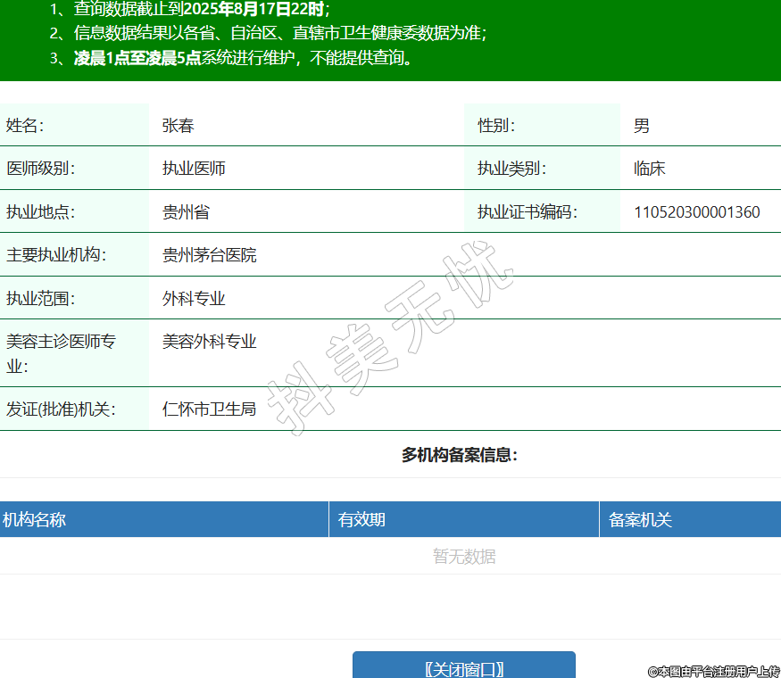 姓名:張春性別:男醫(yī)師級(jí)別:執(zhí)業(yè)醫(yī)師執(zhí)業(yè)類別:臨床執(zhí)業(yè)地點(diǎn):貴州省執(zhí)業(yè)證書(shū)編碼:110520300001360主要執(zhí)業(yè)機(jī)構(gòu):貴州茅臺(tái)醫(yī)院執(zhí)業(yè)范圍:外科專業(yè)美容主診醫(yī)師專業(yè):美容外科專業(yè)發(fā)證(批準(zhǔn))機(jī)關(guān):仁懷市衛(wèi)生局 -