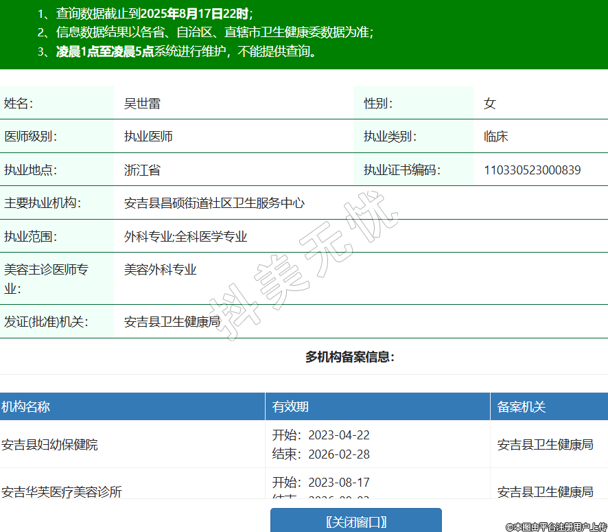 姓名:吳世雷性別:女醫(yī)師級(jí)別:執(zhí)業(yè)醫(yī)師執(zhí)業(yè)類別:臨床執(zhí)業(yè)地點(diǎn):浙江省執(zhí)業(yè)證書編碼:110330523000839主要執(zhí)業(yè)機(jī)構(gòu):安吉縣昌碩街道社區(qū)衛(wèi)生服務(wù)中心執(zhí)業(yè)范圍:外科專業(yè);全科醫(yī)學(xué)專業(yè)美容主診醫(yī)師專業(yè):美容外科專業(yè)發(fā)證(批準(zhǔn))機(jī)關(guān):安吉縣衛(wèi)生健康局多機(jī)構(gòu)備案信息:機(jī)構(gòu)名稱 有效期 備案機(jī)關(guān) 安吉縣婦幼保健院 開始:2023-04-22結(jié)束:2026-02-28安吉縣衛(wèi)生健康局 安吉華芙醫(yī)療美容診所 開始:2023-08-17結(jié)束:2026-08-03安吉縣衛(wèi)生健康局 安吉新顏醫(yī)療美容診所 開始:2024-11-28結(jié)束:2027-11-27安吉縣衛(wèi)生健康局 -