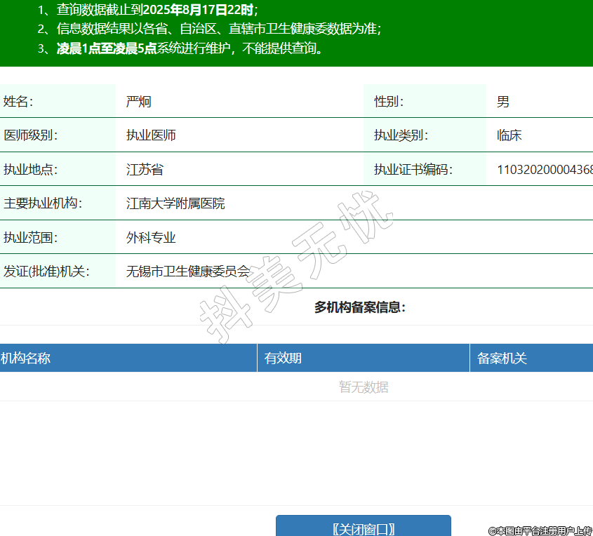 姓名:嚴(yán)炯性別:男醫(yī)師級(jí)別:執(zhí)業(yè)醫(yī)師執(zhí)業(yè)類別:臨床執(zhí)業(yè)地點(diǎn):江蘇省執(zhí)業(yè)證書編碼:110320200004368主要執(zhí)業(yè)機(jī)構(gòu):江南大學(xué)附屬醫(yī)院執(zhí)業(yè)范圍:外科專業(yè)發(fā)證(批準(zhǔn))機(jī)關(guān):無錫市衛(wèi)生健康委員會(huì) -