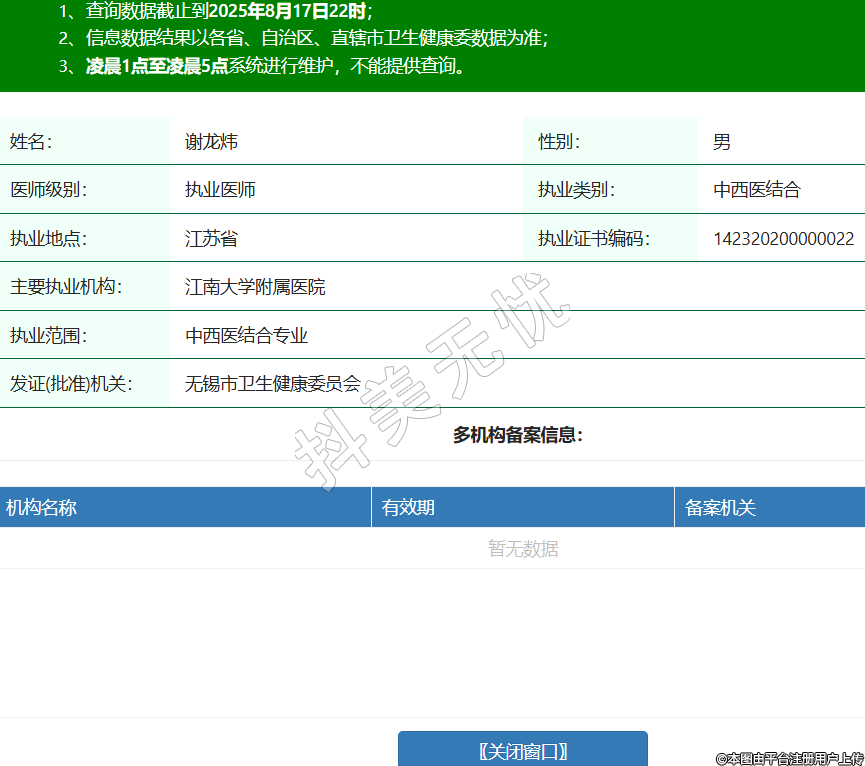 姓名:謝龍煒性別:男醫(yī)師級別:執(zhí)業(yè)醫(yī)師執(zhí)業(yè)類別:中西醫(yī)結(jié)合執(zhí)業(yè)地點:江蘇省執(zhí)業(yè)證書編碼:142320200000022主要執(zhí)業(yè)機構(gòu):江南大學(xué)附屬醫(yī)院執(zhí)業(yè)范圍:中西醫(yī)結(jié)合專業(yè)發(fā)證(批準(zhǔn))機關(guān):無錫市衛(wèi)生健康委員會 -