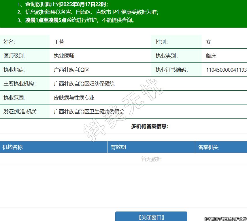 姓名:王芳性別:女醫(yī)師級別:執(zhí)業(yè)醫(yī)師執(zhí)業(yè)類別:臨床執(zhí)業(yè)地點:廣西壯族自治區(qū)執(zhí)業(yè)證書編碼:110450000041193主要執(zhí)業(yè)機構:廣西壯族自治區(qū)婦幼保健院執(zhí)業(yè)范圍:皮膚病與性病專業(yè)發(fā)證(批準)機關:廣西壯族自治區(qū)衛(wèi)生健康委員會 -