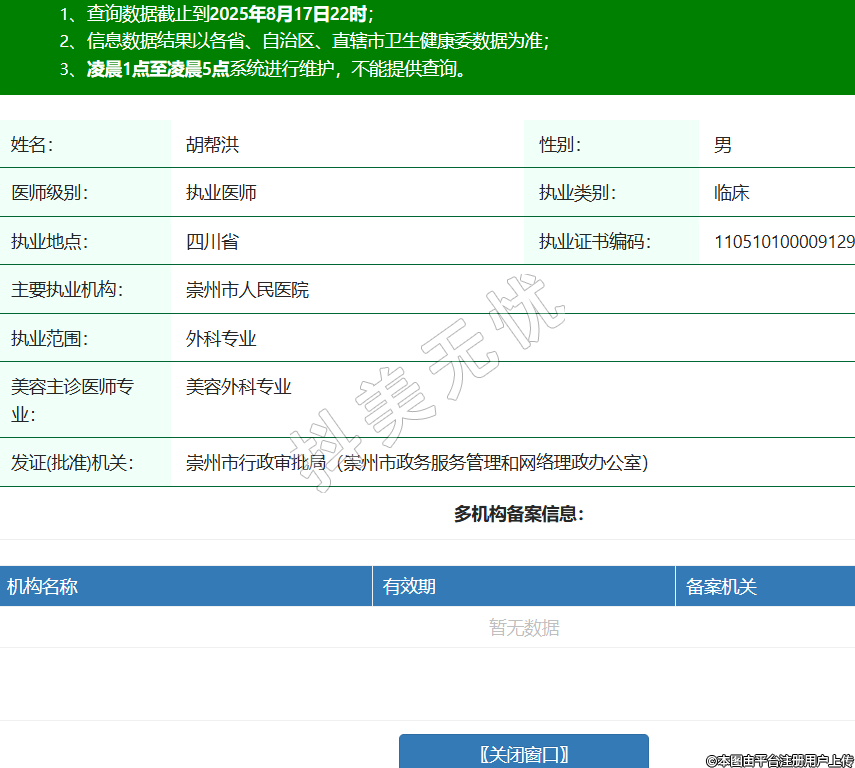 姓名:胡幫洪性別:男醫(yī)師級(jí)別:執(zhí)業(yè)醫(yī)師執(zhí)業(yè)類別:臨床執(zhí)業(yè)地點(diǎn):四川省執(zhí)業(yè)證書編碼:110510100009129主要執(zhí)業(yè)機(jī)構(gòu):崇州市人民醫(yī)院執(zhí)業(yè)范圍:外科專業(yè)美容主診醫(yī)師專業(yè):美容外科專業(yè)發(fā)證(批準(zhǔn))機(jī)關(guān):崇州市行政審批局(崇州市政務(wù)服務(wù)管理和網(wǎng)絡(luò)理政辦公室) -