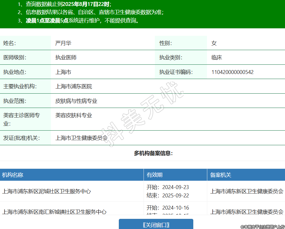 姓名:嚴(yán)月華性別:女醫(yī)師級別:執(zhí)業(yè)醫(yī)師執(zhí)業(yè)類別:臨床執(zhí)業(yè)地點(diǎn):上海市執(zhí)業(yè)證書編碼:110420000000542主要執(zhí)業(yè)機(jī)構(gòu):上海市浦東醫(yī)院執(zhí)業(yè)范圍:皮膚病與性病專業(yè)美容主診醫(yī)師專業(yè):美容皮膚科專業(yè)發(fā)證(批準(zhǔn))機(jī)關(guān):上海市衛(wèi)生健康委員會多機(jī)構(gòu)備案信息:機(jī)構(gòu)名稱 有效期 備案機(jī)關(guān) 上海市浦東新區(qū)泥城社區(qū)衛(wèi)生服務(wù)中心 開始:2024-09-23結(jié)束:2025-09-22上海市浦東新區(qū)衛(wèi)生健康委員會 上海市浦東新區(qū)南匯新城鎮(zhèn)社區(qū)衛(wèi)生服務(wù)中心 開始:2024-10-16結(jié)束:2025-10-15上海市浦東新區(qū)衛(wèi)生健康委員會 -