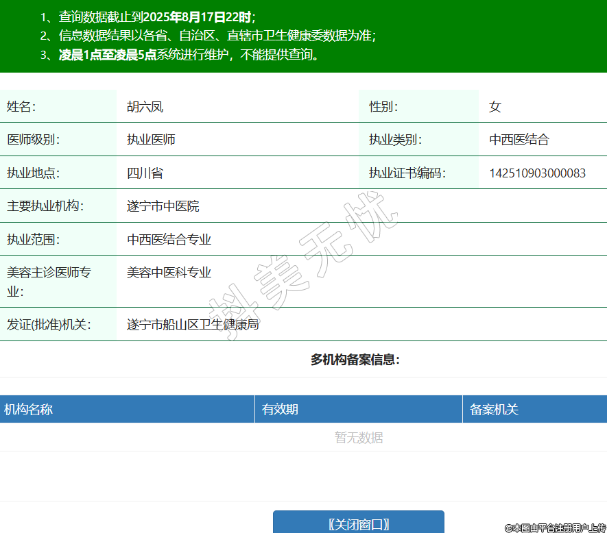 姓名:胡六鳳性別:女醫(yī)師級別:執(zhí)業(yè)醫(yī)師執(zhí)業(yè)類別:中西醫(yī)結(jié)合執(zhí)業(yè)地點:四川省執(zhí)業(yè)證書編碼:142510903000083主要執(zhí)業(yè)機構(gòu):遂寧市中醫(yī)院執(zhí)業(yè)范圍:中西醫(yī)結(jié)合專業(yè)美容主診醫(yī)師專業(yè):美容中醫(yī)科專業(yè)發(fā)證(批準)機關(guān):遂寧市船山區(qū)衛(wèi)生健康局 -