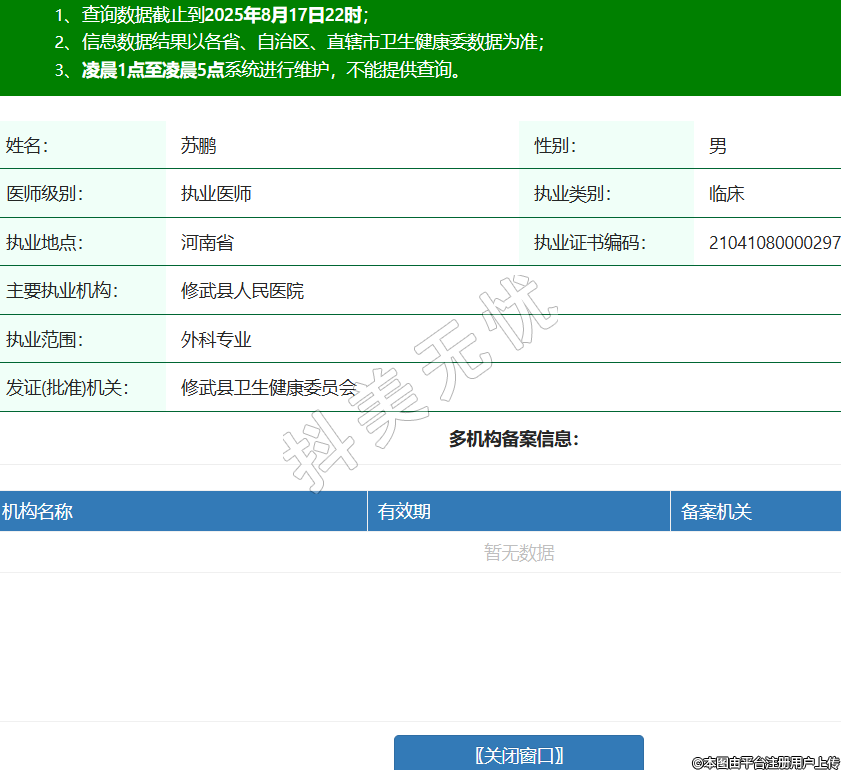 姓名:蘇鵬性別:男醫(yī)師級別:執(zhí)業(yè)醫(yī)師執(zhí)業(yè)類別:臨床執(zhí)業(yè)地點:河南省執(zhí)業(yè)證書編碼:210410800002972主要執(zhí)業(yè)機構(gòu):修武縣人民醫(yī)院執(zhí)業(yè)范圍:外科專業(yè)發(fā)證(批準)機關(guān):修武縣衛(wèi)生健康委員會 -