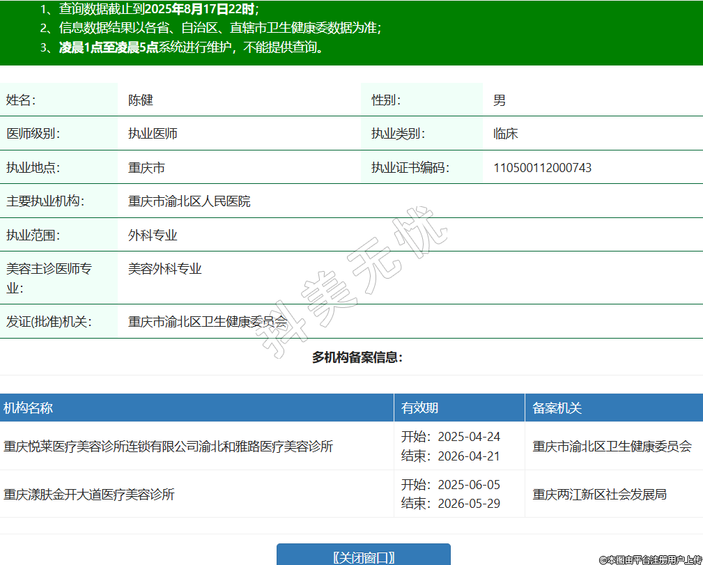 姓名:陳健性別:男醫(yī)師級別:執(zhí)業(yè)醫(yī)師執(zhí)業(yè)類別:臨床執(zhí)業(yè)地點:重慶市執(zhí)業(yè)證書編碼:110500112000743主要執(zhí)業(yè)機構:重慶市渝北區(qū)人民醫(yī)院執(zhí)業(yè)范圍:外科專業(yè)美容主診醫(yī)師專業(yè):美容外科專業(yè)發(fā)證(批準)機關:重慶市渝北區(qū)衛(wèi)生健康委員會多機構備案信息:機構名稱 有效期 備案機關 重慶悅萊醫(yī)療美容診所連鎖有限公司渝北和雅路醫(yī)療美容診所 開始:2025-04-24結束:2026-04-21重慶市渝北區(qū)衛(wèi)生健康委員會 重慶漾膚金開大道醫(yī)療美容診所 開始:2025-06-05結束:2026-05-29重慶兩江新區(qū)社會發(fā)展局 -