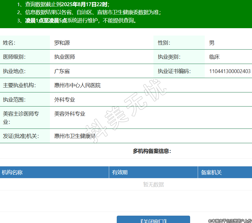 姓名:羅和源性別:男醫(yī)師級別:執(zhí)業(yè)醫(yī)師執(zhí)業(yè)類別:臨床執(zhí)業(yè)地點:廣東省執(zhí)業(yè)證書編碼:110441300002403主要執(zhí)業(yè)機構(gòu):惠州市中心人民醫(yī)院執(zhí)業(yè)范圍:外科專業(yè)美容主診醫(yī)師專業(yè):美容外科專業(yè)發(fā)證(批準)機關(guān):惠州市衛(wèi)生健康局 -