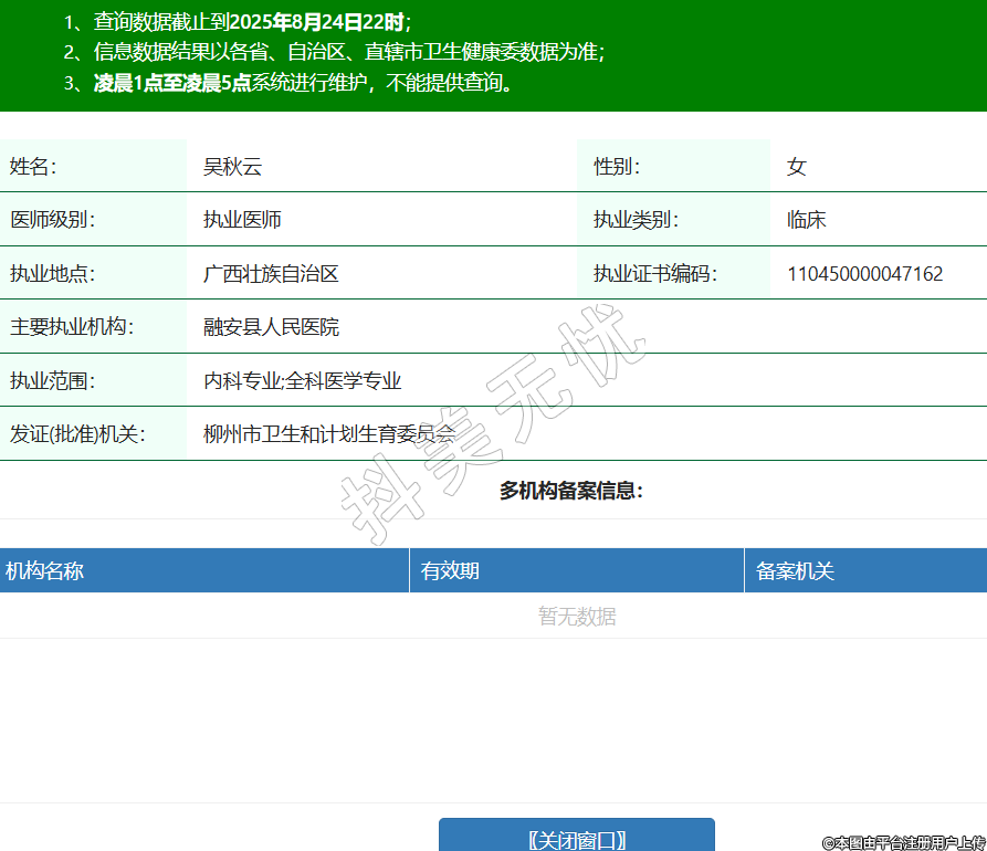 姓名:吳秋云性別:女醫(yī)師級(jí)別:執(zhí)業(yè)醫(yī)師執(zhí)業(yè)類別:臨床執(zhí)業(yè)地點(diǎn):廣西壯族自治區(qū)執(zhí)業(yè)證書(shū)編碼:110450000047162主要執(zhí)業(yè)機(jī)構(gòu):融安縣人民醫(yī)院執(zhí)業(yè)范圍:內(nèi)科專業(yè);全科醫(yī)學(xué)專業(yè)發(fā)證(批準(zhǔn))機(jī)關(guān):柳州市衛(wèi)生和計(jì)劃生育委員會(huì) -