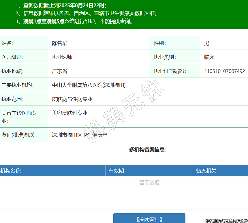 姓名:陳名華性別:男醫(yī)師級別:執(zhí)業(yè)醫(yī)師執(zhí)業(yè)類別:臨床執(zhí)業(yè)地點:廣東省執(zhí)業(yè)證書編碼:110510107007492主要執(zhí)業(yè)機構:中山大學附屬第八醫(yī)院(深圳福田)執(zhí)業(yè)范圍:皮膚病與性病專業(yè)美容主診醫(yī)師專業(yè):美容皮膚科專業(yè)發(fā)證(批準)機關:深圳市福田區(qū)衛(wèi)生健康局 -
