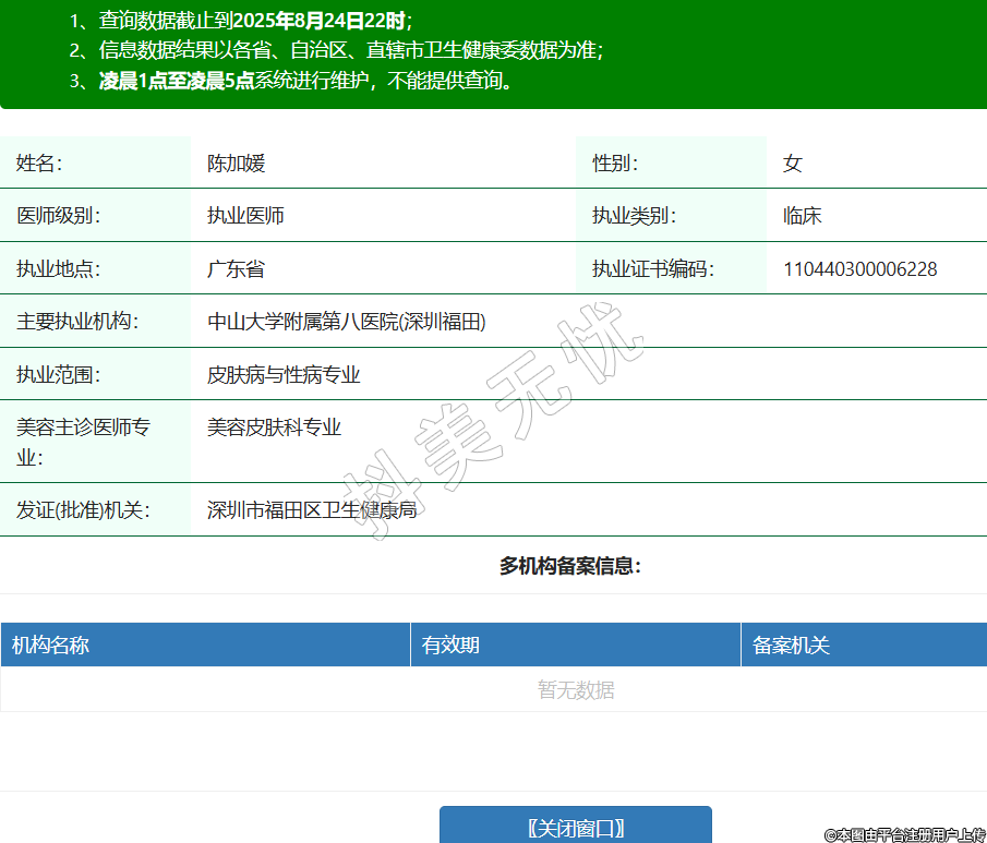 姓名:陳加媛性別:女醫(yī)師級別:執(zhí)業(yè)醫(yī)師執(zhí)業(yè)類別:臨床執(zhí)業(yè)地點(diǎn):廣東省執(zhí)業(yè)證書編碼:110440300006228主要執(zhí)業(yè)機(jī)構(gòu):中山大學(xué)附屬第八醫(yī)院(深圳福田)執(zhí)業(yè)范圍:皮膚病與性病專業(yè)美容主診醫(yī)師專業(yè):美容皮膚科專業(yè)發(fā)證(批準(zhǔn))機(jī)關(guān):深圳市福田區(qū)衛(wèi)生健康局 -