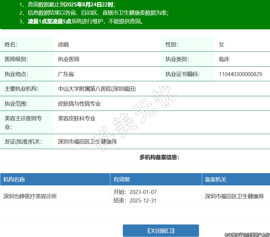 姓名:徐娟性別:女醫(yī)師級別:執(zhí)業(yè)醫(yī)師執(zhí)業(yè)類別:臨床執(zhí)業(yè)地點(diǎn):廣東省執(zhí)業(yè)證書編碼:110440300000829主要執(zhí)業(yè)機(jī)構(gòu):中山大學(xué)附屬第八醫(yī)院(深圳福田)執(zhí)業(yè)范圍:皮膚病與性病專業(yè)美容主診醫(yī)師專業(yè):美容皮膚科專業(yè)發(fā)證(批準(zhǔn))機(jī)關(guān):深圳市福田區(qū)衛(wèi)生健康局多機(jī)構(gòu)備案信息:機(jī)構(gòu)名稱 有效期 備案機(jī)關(guān) 深圳也婷醫(yī)療美容診所 開始:2023-01-07結(jié)束:2025-12-31深圳市福田區(qū)衛(wèi)生健康局 -