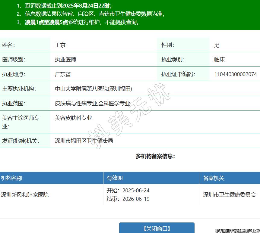 姓名:王京性別:男醫(yī)師級(jí)別:執(zhí)業(yè)醫(yī)師執(zhí)業(yè)類別:臨床執(zhí)業(yè)地點(diǎn):廣東省執(zhí)業(yè)證書編碼:110440300002074主要執(zhí)業(yè)機(jī)構(gòu):中山大學(xué)附屬第八醫(yī)院(深圳福田)執(zhí)業(yè)范圍:皮膚病與性病專業(yè);全科醫(yī)學(xué)專業(yè)美容主診醫(yī)師專業(yè):美容皮膚科專業(yè)發(fā)證(批準(zhǔn))機(jī)關(guān):深圳市福田區(qū)衛(wèi)生健康局多機(jī)構(gòu)備案信息:機(jī)構(gòu)名稱 有效期 備案機(jī)關(guān) 深圳新風(fēng)和睦家醫(yī)院 開(kāi)始:2025-06-24結(jié)束:2026-06-19深圳市衛(wèi)生健康委員會(huì) -