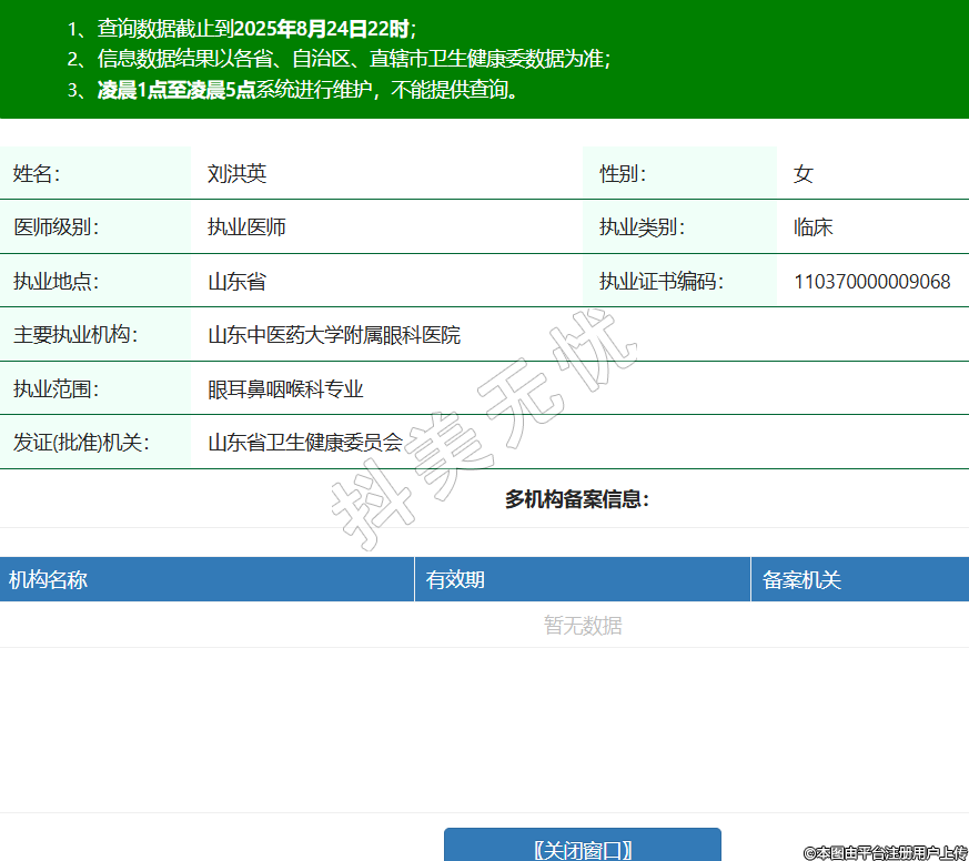 姓名:劉洪英性別:女醫(yī)師級別:執(zhí)業(yè)醫(yī)師執(zhí)業(yè)類別:臨床執(zhí)業(yè)地點:山東省執(zhí)業(yè)證書編碼:110370000009068主要執(zhí)業(yè)機構:山東中醫(yī)藥大學附屬眼科醫(yī)院執(zhí)業(yè)范圍:眼耳鼻咽喉科專業(yè)發(fā)證(批準)機關:山東省衛(wèi)生健康委員會 -