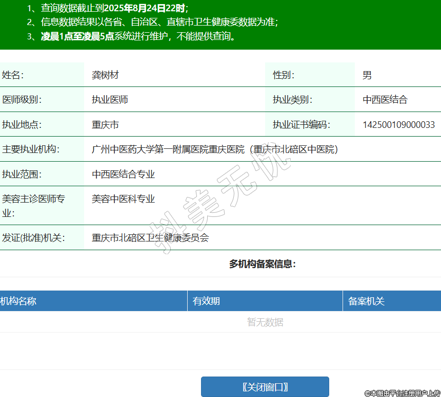 姓名:龔樹材性別:男醫(yī)師級別:執(zhí)業(yè)醫(yī)師執(zhí)業(yè)類別:中西醫(yī)結(jié)合執(zhí)業(yè)地點:重慶市執(zhí)業(yè)證書編碼:142500109000033主要執(zhí)業(yè)機構(gòu):廣州中醫(yī)藥大學第一附屬醫(yī)院重慶醫(yī)院(重慶市北碚區(qū)中醫(yī)院)執(zhí)業(yè)范圍:中西醫(yī)結(jié)合專業(yè)美容主診醫(yī)師專業(yè):美容中醫(yī)科專業(yè)發(fā)證(批準)機關(guān):重慶市北碚區(qū)衛(wèi)生健康委員會 -