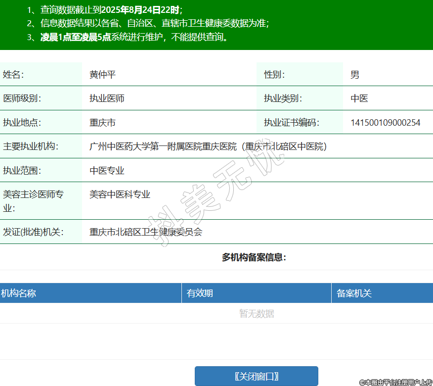姓名:黃仲平性別:男醫(yī)師級別:執(zhí)業(yè)醫(yī)師執(zhí)業(yè)類別:中醫(yī)執(zhí)業(yè)地點:重慶市執(zhí)業(yè)證書編碼:141500109000254主要執(zhí)業(yè)機構(gòu):廣州中醫(yī)藥大學第一附屬醫(yī)院重慶醫(yī)院(重慶市北碚區(qū)中醫(yī)院)執(zhí)業(yè)范圍:中醫(yī)專業(yè)美容主診醫(yī)師專業(yè):美容中醫(yī)科專業(yè)發(fā)證(批準)機關(guān):重慶市北碚區(qū)衛(wèi)生健康委員會 -