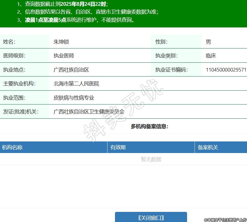 姓名:朱坤鎖性別:男醫(yī)師級(jí)別:執(zhí)業(yè)醫(yī)師執(zhí)業(yè)類(lèi)別:臨床執(zhí)業(yè)地點(diǎn):廣西壯族自治區(qū)執(zhí)業(yè)證書(shū)編碼:110450000029571主要執(zhí)業(yè)機(jī)構(gòu):北海市第二人民醫(yī)院執(zhí)業(yè)范圍:皮膚病與性病專業(yè)發(fā)證(批準(zhǔn))機(jī)關(guān):廣西壯族自治區(qū)衛(wèi)生健康委員會(huì) -