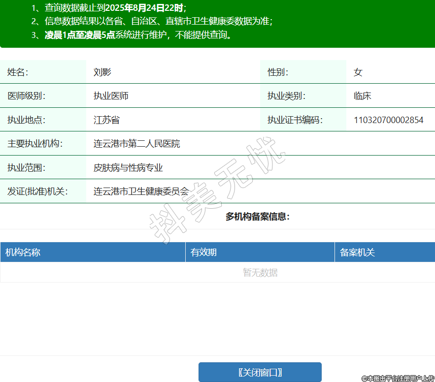 姓名:劉影性別:女醫(yī)師級(jí)別:執(zhí)業(yè)醫(yī)師執(zhí)業(yè)類別:臨床執(zhí)業(yè)地點(diǎn):江蘇省執(zhí)業(yè)證書(shū)編碼:110320700002854主要執(zhí)業(yè)機(jī)構(gòu):連云港市第二人民醫(yī)院執(zhí)業(yè)范圍:皮膚病與性病專業(yè)發(fā)證(批準(zhǔn))機(jī)關(guān):連云港市衛(wèi)生健康委員會(huì) -