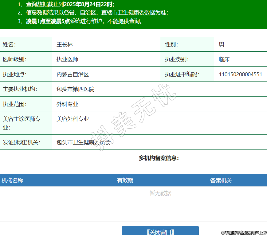 姓名:王長林性別:男醫(yī)師級(jí)別:執(zhí)業(yè)醫(yī)師執(zhí)業(yè)類別:臨床執(zhí)業(yè)地點(diǎn):內(nèi)蒙古自治區(qū)執(zhí)業(yè)證書編碼:110150200004551主要執(zhí)業(yè)機(jī)構(gòu):包頭市第四醫(yī)院執(zhí)業(yè)范圍:外科專業(yè)美容主診醫(yī)師專業(yè):美容外科專業(yè)發(fā)證(批準(zhǔn))機(jī)關(guān):包頭市衛(wèi)生健康委員會(huì) -