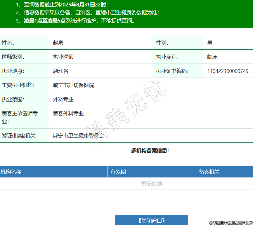 姓名:趙泉性別:男醫(yī)師級(jí)別:執(zhí)業(yè)醫(yī)師執(zhí)業(yè)類別:臨床執(zhí)業(yè)地點(diǎn):湖北省執(zhí)業(yè)證書編碼:110422300000749主要執(zhí)業(yè)機(jī)構(gòu):咸寧市婦幼保健院執(zhí)業(yè)范圍:外科專業(yè)美容主診醫(yī)師專業(yè):美容外科專業(yè)發(fā)證(批準(zhǔn))機(jī)關(guān):咸寧市衛(wèi)生健康委員會(huì) -
