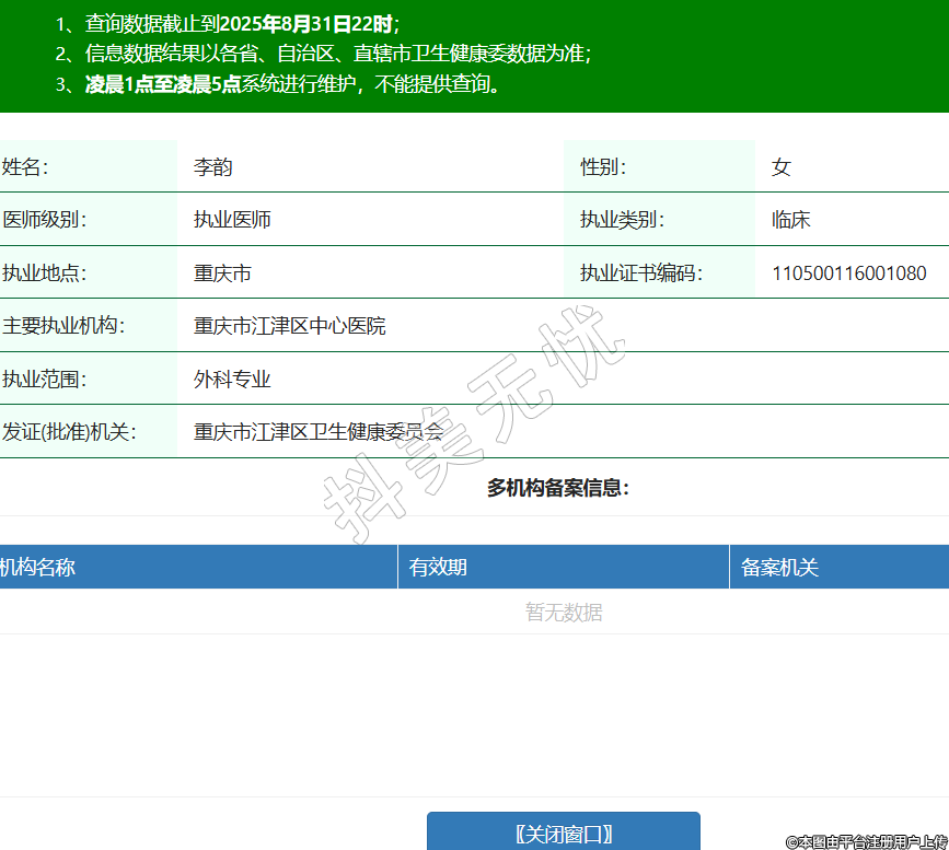 姓名:李韻性別:女醫(yī)師級別:執(zhí)業(yè)醫(yī)師執(zhí)業(yè)類別:臨床執(zhí)業(yè)地點:重慶市執(zhí)業(yè)證書編碼:110500116001080主要執(zhí)業(yè)機構:重慶市江津區(qū)中心醫(yī)院執(zhí)業(yè)范圍:外科專業(yè)發(fā)證(批準)機關:重慶市江津區(qū)衛(wèi)生健康委員會 -