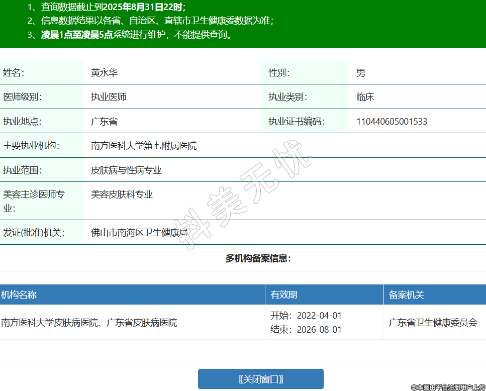 姓名:黃永華性別:男醫(yī)師級(jí)別:執(zhí)業(yè)醫(yī)師執(zhí)業(yè)類別:臨床執(zhí)業(yè)地點(diǎn):廣東省執(zhí)業(yè)證書編碼:110440605001533主要執(zhí)業(yè)機(jī)構(gòu):南方醫(yī)科大學(xué)第七附屬醫(yī)院執(zhí)業(yè)范圍:皮膚病與性病專業(yè)美容主診醫(yī)師專業(yè):美容皮膚科專業(yè)發(fā)證(批準(zhǔn))機(jī)關(guān):佛山市南海區(qū)衛(wèi)生健康局多機(jī)構(gòu)備案信息:機(jī)構(gòu)名稱 有效期 備案機(jī)關(guān) 南方醫(yī)科大學(xué)皮膚病醫(yī)院、廣東省皮膚病醫(yī)院 開始:2022-04-01結(jié)束:2026-08-01廣東省衛(wèi)生健康委員會(huì) -
