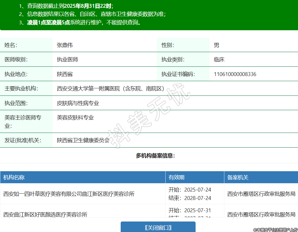 姓名:張鼎偉性別:男醫(yī)師級(jí)別:執(zhí)業(yè)醫(yī)師執(zhí)業(yè)類別:臨床執(zhí)業(yè)地點(diǎn):陜西省執(zhí)業(yè)證書編碼:110610000008336主要執(zhí)業(yè)機(jī)構(gòu):西安交通大學(xué)第一附屬醫(yī)院(含東院、南院區(qū))執(zhí)業(yè)范圍:皮膚病與性病專業(yè)美容主診醫(yī)師專業(yè):美容皮膚科專業(yè)發(fā)證(批準(zhǔn))機(jī)關(guān):陜西省衛(wèi)生健康委員會(huì)多機(jī)構(gòu)備案信息:機(jī)構(gòu)名稱 有效期 備案機(jī)關(guān) 西安如一四葉草醫(yī)療美容有限公司曲江新區(qū)醫(yī)療美容診所 開始:2025-07-24結(jié)束:2028-07-24西安市雁塔區(qū)行政審批服務(wù)局 西安曲江新區(qū)好醫(yī)顏選醫(yī)療美容診所 開始:2025-07-31結(jié)束:2027-07-31西安市雁塔區(qū)行政審批服務(wù)局 -
