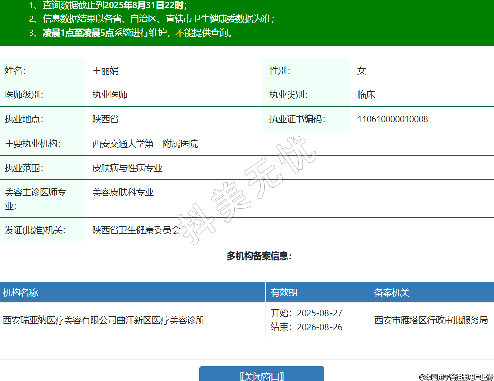 姓名:王麗娟性別:女醫(yī)師級別:執(zhí)業(yè)醫(yī)師執(zhí)業(yè)類別:臨床執(zhí)業(yè)地點:陜西省執(zhí)業(yè)證書編碼:110610000010008主要執(zhí)業(yè)機構(gòu):西安交通大學(xué)第一附屬醫(yī)院執(zhí)業(yè)范圍:皮膚病與性病專業(yè)美容主診醫(yī)師專業(yè):美容皮膚科專業(yè)發(fā)證(批準(zhǔn))機關(guān):陜西省衛(wèi)生健康委員會多機構(gòu)備案信息:機構(gòu)名稱 有效期 備案機關(guān) 西安瑞亞納醫(yī)療美容有限公司曲江新區(qū)醫(yī)療美容診所 開始:2025-08-27結(jié)束:2026-08-26西安市雁塔區(qū)行政審批服務(wù)局 -