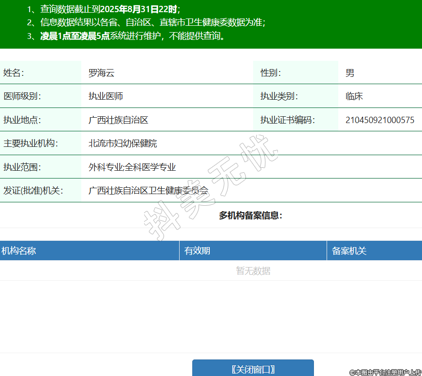 姓名:羅海云性別:男醫(yī)師級別:執(zhí)業(yè)醫(yī)師執(zhí)業(yè)類別:臨床執(zhí)業(yè)地點:廣西壯族自治區(qū)執(zhí)業(yè)證書編碼:210450921000575主要執(zhí)業(yè)機構(gòu):北流市婦幼保健院執(zhí)業(yè)范圍:外科專業(yè);全科醫(yī)學專業(yè)發(fā)證(批準)機關:廣西壯族自治區(qū)衛(wèi)生健康委員會 -
