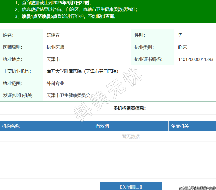 姓名:阮建春性別:男醫(yī)師級(jí)別:執(zhí)業(yè)醫(yī)師執(zhí)業(yè)類別:臨床執(zhí)業(yè)地點(diǎn):天津市執(zhí)業(yè)證書編碼:110120000011393主要執(zhí)業(yè)機(jī)構(gòu):南開大學(xué)附屬醫(yī)院(天津市第四醫(yī)院)執(zhí)業(yè)范圍:外科專業(yè)發(fā)證(批準(zhǔn))機(jī)關(guān):天津市衛(wèi)生健康委員會(huì) -