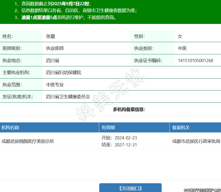 姓名:張霞性別:女醫(yī)師級別:執(zhí)業(yè)醫(yī)師執(zhí)業(yè)類別:中醫(yī)執(zhí)業(yè)地點:四川省執(zhí)業(yè)證書編碼:141510105001268主要執(zhí)業(yè)機構:四川省婦幼保健院執(zhí)業(yè)范圍:中醫(yī)專業(yè)發(fā)證(批準)機關:四川省衛(wèi)生健康委員會多機構備案信息:機構名稱 有效期 備案機關 成都武侯傾顏醫(yī)療美容診所 開始:2024-02-23結束:2027-12-31成都市武侯區(qū)行政審批局 -